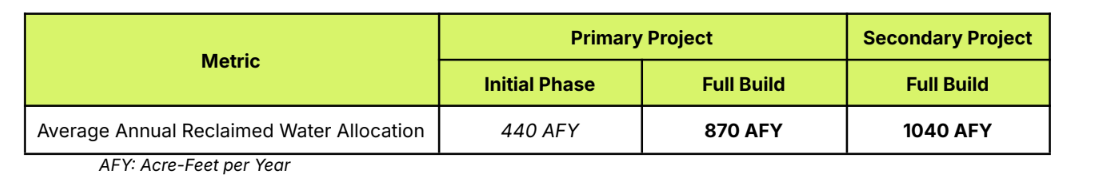 Tucson officials say they have enough capacity to supply reclaimed water. By 2026, the city expects to have access to 32,000 acre-feet per year — 22,000 AFY from treated sewage and another 10,000 AFY from the TARP plant — far more than enough to feed Project Blue’s total expected demand of 1,900 acre-feet.