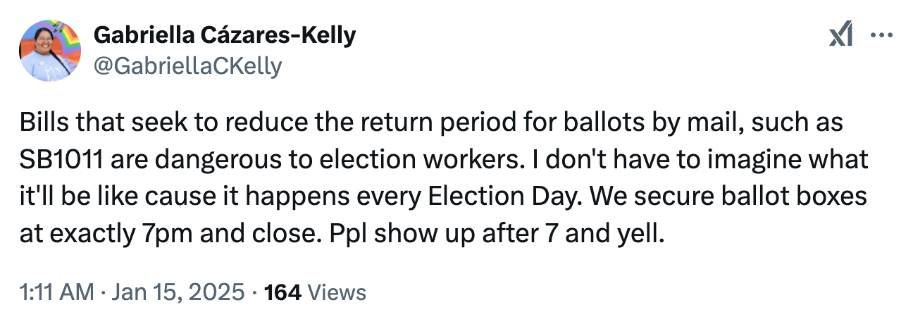 Pushing back: The legislative session is in full swing, and local officials are starting to respond to bills that get under their skin. Pima County Recorder Gabriella Cázares-Kelly took to social media yesterday evening to call out SB1011, a bill that would cut the time voters can return ballots by mail in an effort to get election results faster. She wrote more than a dozen tweets explaining the dynamics of last-minute voting and arguing that more equipment and office space would be a better fix than what’s in the bill.