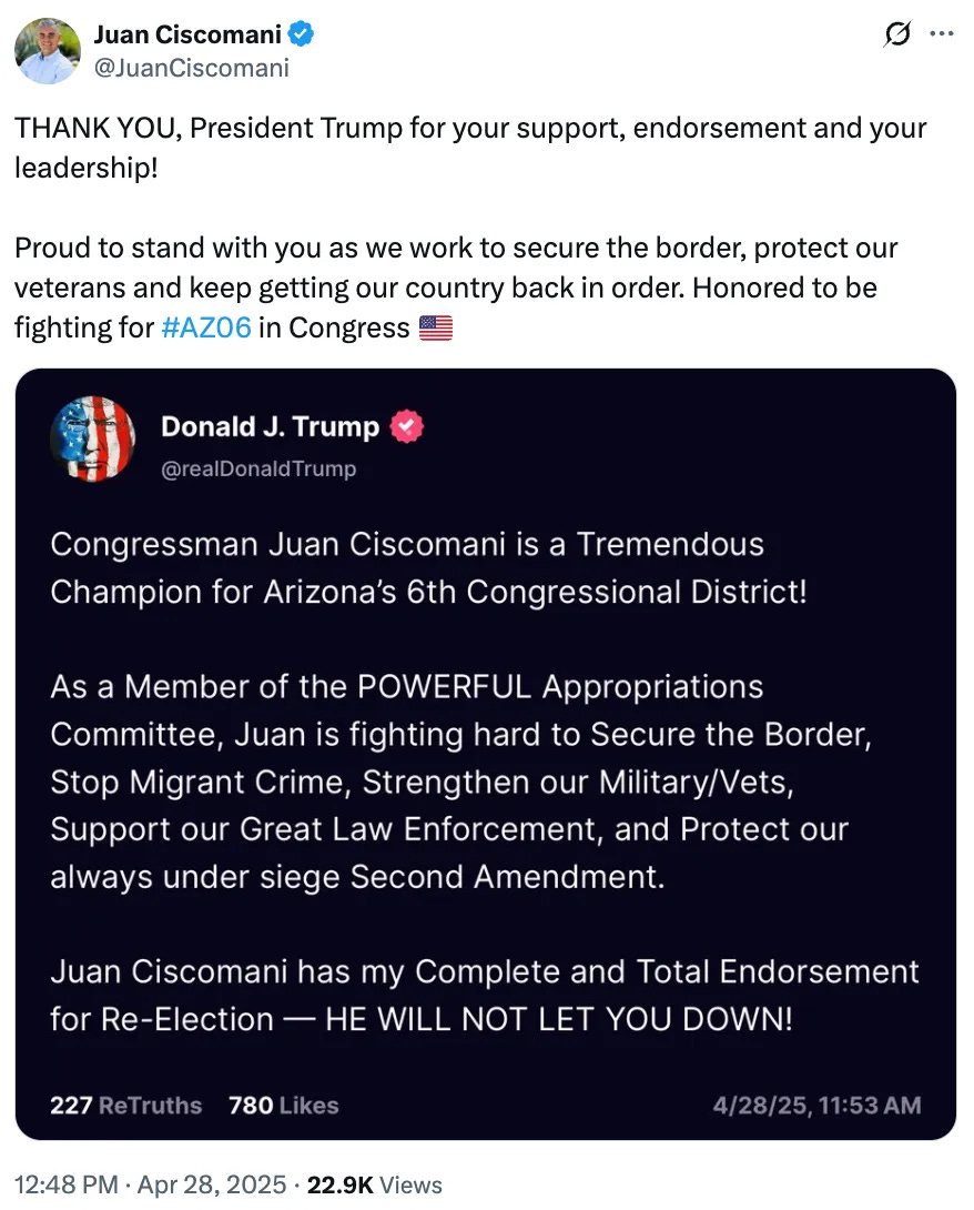 A two-term Republican, Ciscomani has proven popular in GOP circles, defeating former state Rep. Kirsten Engel in both 2022 and 2024.