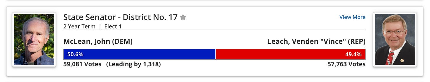 Legislative District 17: Democrat John McLean was leading Republican Vince Leach in the race for the district’s Senate seat. McLean was up by more than 1,300 votes.