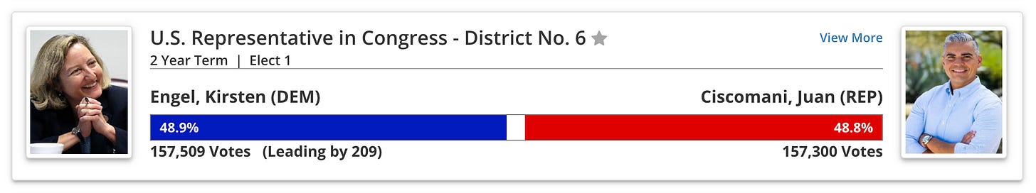 Congressional District 6: Democrat Kirsten Engel pulled ahead of Republican incumbent Rep. Juan Ciscomani in this tight race. She was up by 209 votes as of Friday morning.
