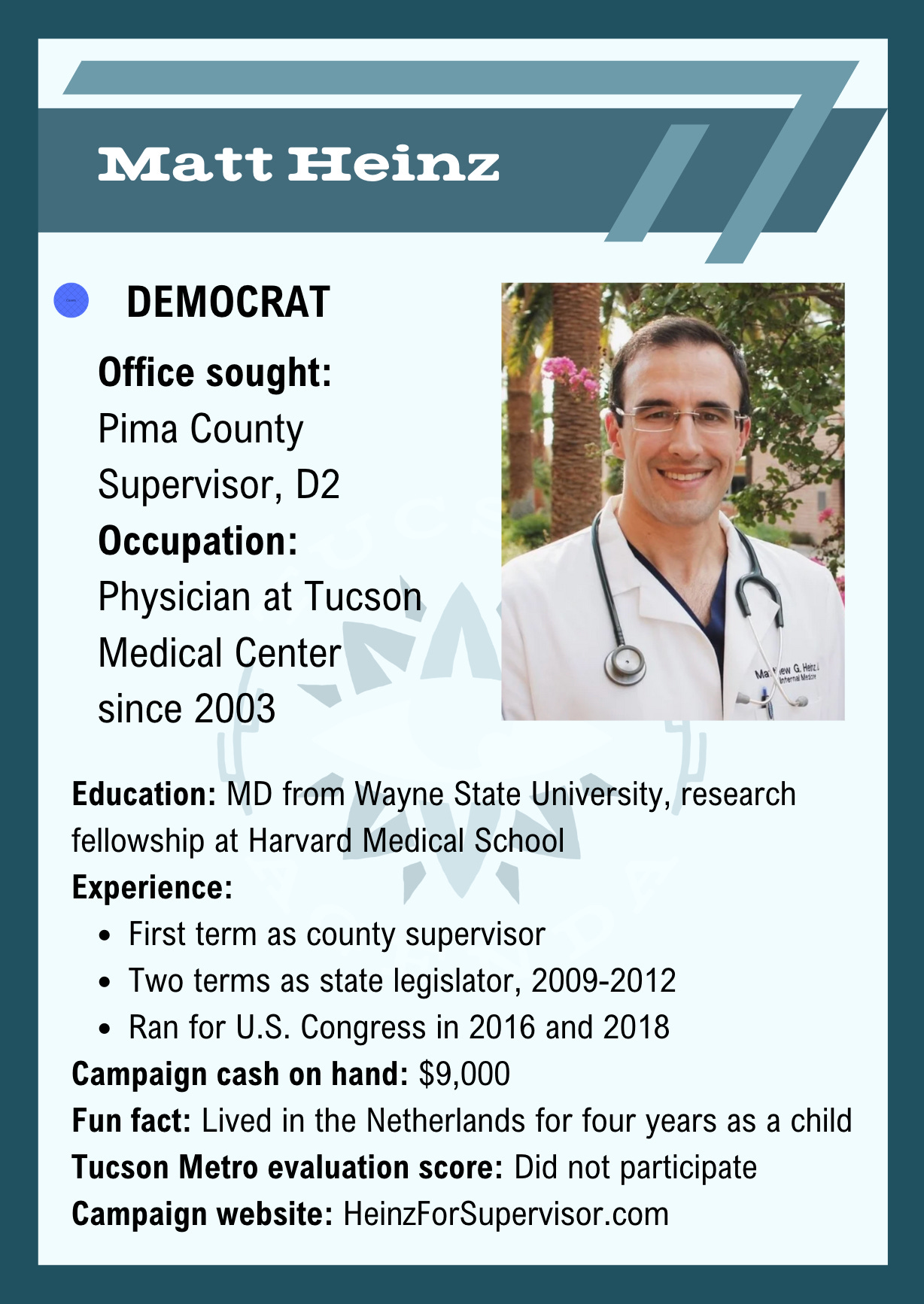 Pima County Supervisor Matt Heinz is trying to keep his seat in District 2 as he faces a challenge from Republican John Backer.