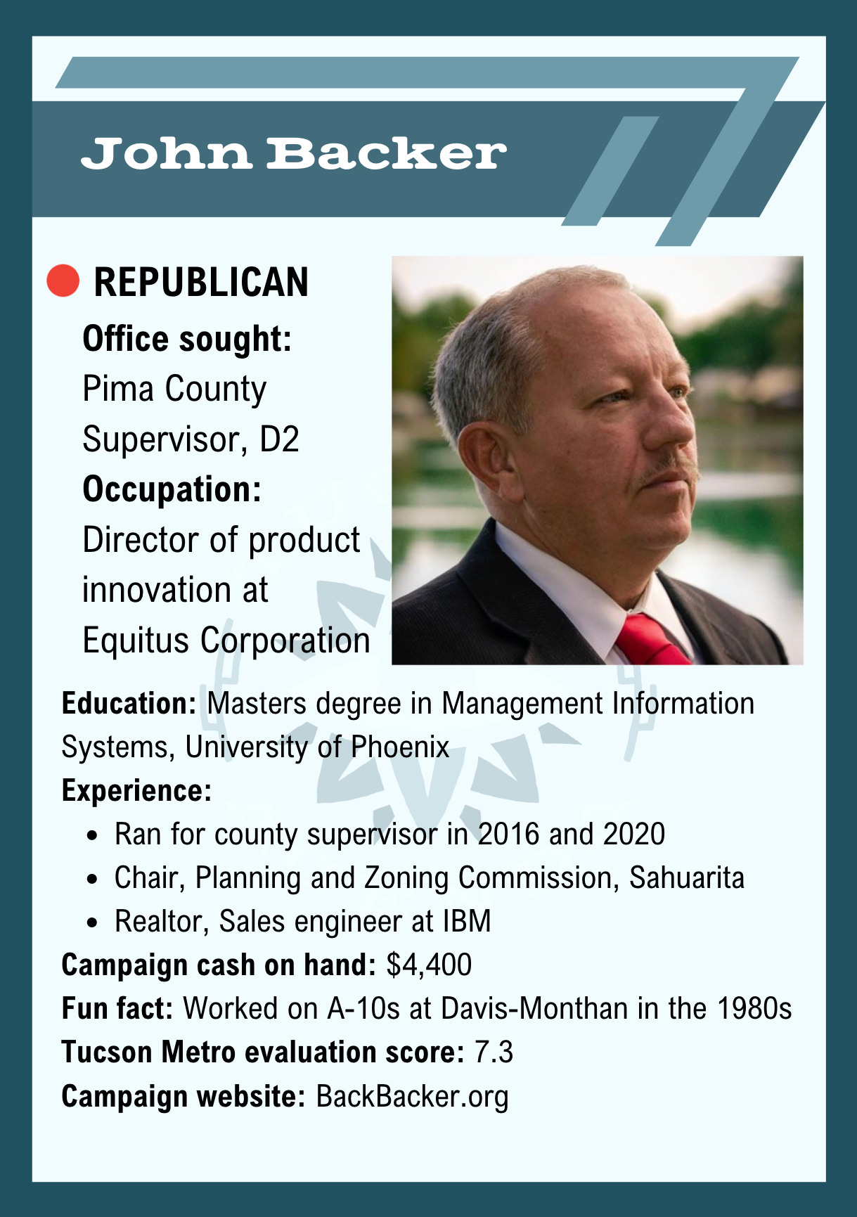 Backer was endorsed by Sahuarita Mayor Tom Murphy, Sahuarita Town Council members Bill Bracco and Diane Priolo, and the Arizona Conference of Police and Sheriffs.