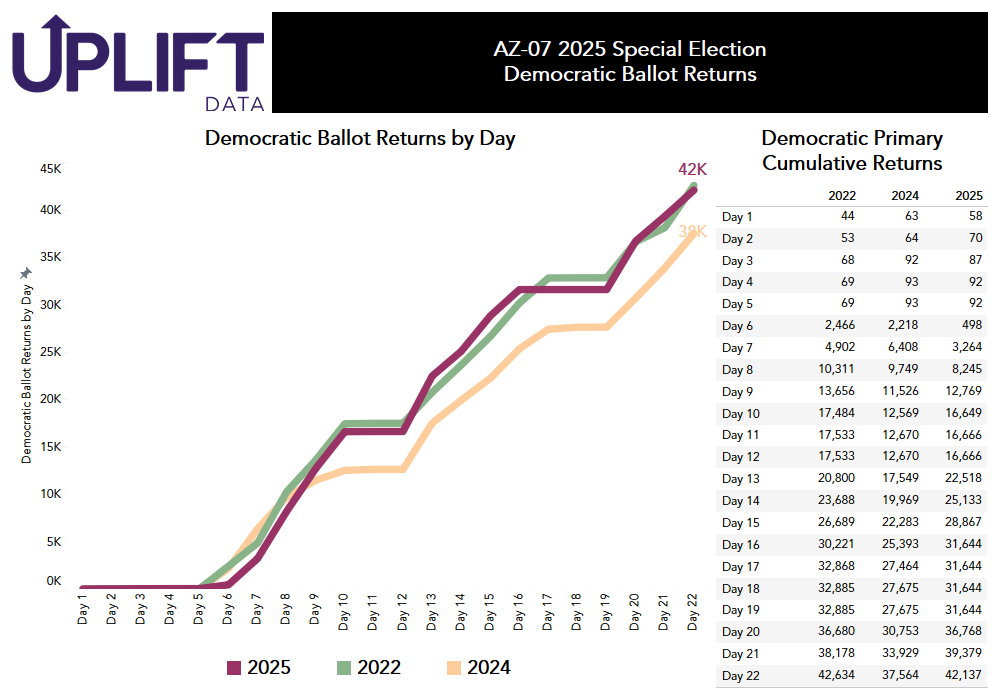 We worked closely with Sam Almy, the data guru at Uplift Campaigns, to do the math for the returned ballots in the CD7 special election — specifically Democratic ballots — up until last Thursday.