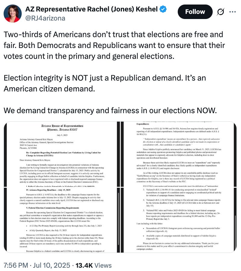 Republican state Rep. Rachel Keshel is asking Arizona Attorney General Kris Mayes to investigate whether LUCHA “unlawfully collected early ballots” and violated other campaign finance-related laws on behalf of Adelita Grijalva.