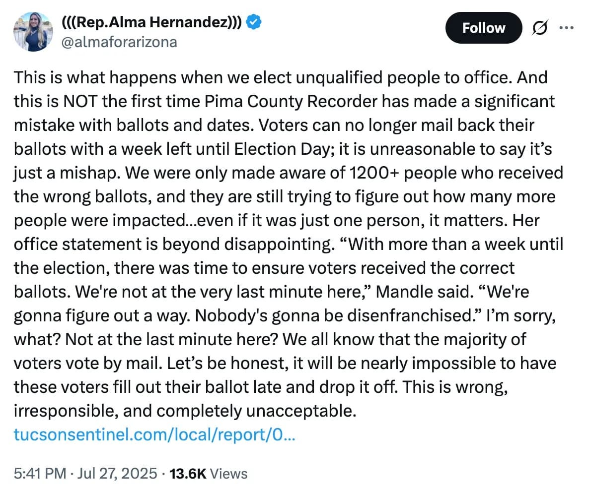 Sounding off: Democratic state Rep. Alma Hernandez went off on Pima County Recorder Gabriella Cázares-Kelly over a screwup that led to 358 voters getting mailed the wrong ballot for the upcoming primary elections. A representative for the Recorder’s Office declined to respond to the tweet, saying Cázares-Kelly is focused on the upcoming elections and doesn’t have time to respond to politically motivated attacks from a fellow Democrat.