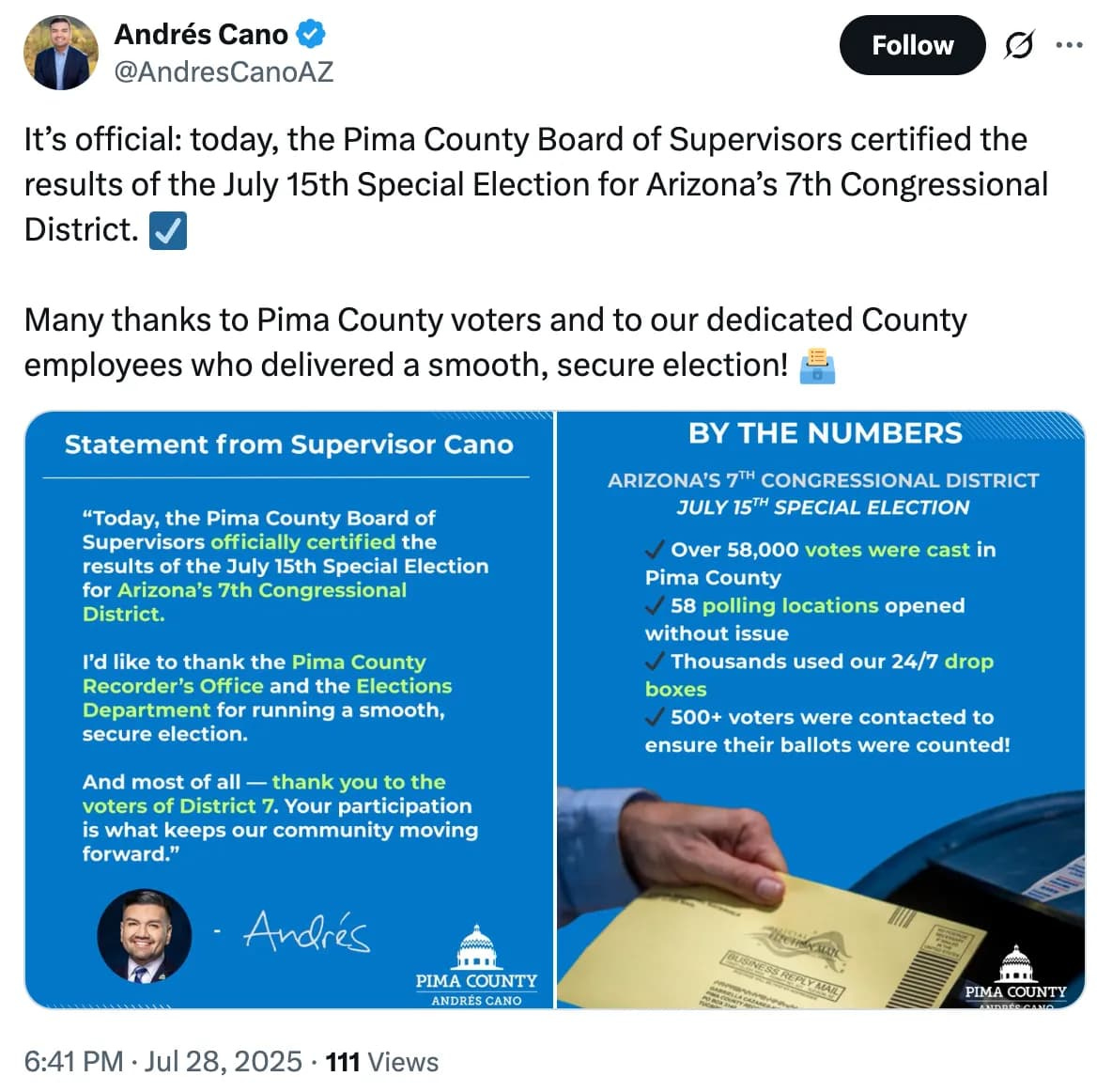 Now that the Pima County election canvass is complete, we know that Quintana, a write-in candidate, clinched the nomination with a grand total of 37 votes in Pima County — which, yes, is technically a win.1