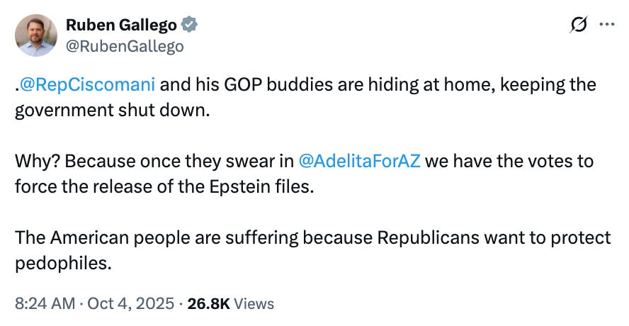 “Canceling votes to remain in recess while the government is shut down is an abject failure of leadership,” Grijalva said. “Republicans should be ashamed. I demand to be sworn in immediately. There is no reason to delay my swearing-in and it begs the question of their motivation in doing so.”