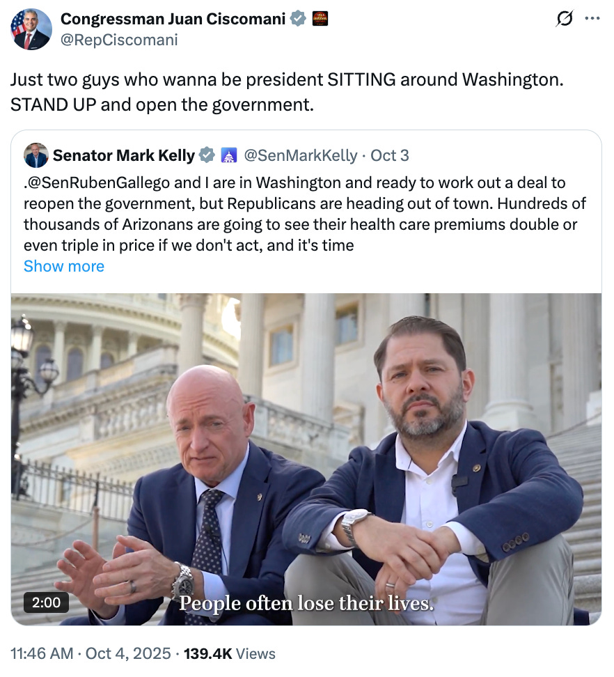 A review of his social media posts over the last week shows Ciscomani largely blaming the shutdown on Democrats, often singling out Sens. Mark Kelly and Gallego.