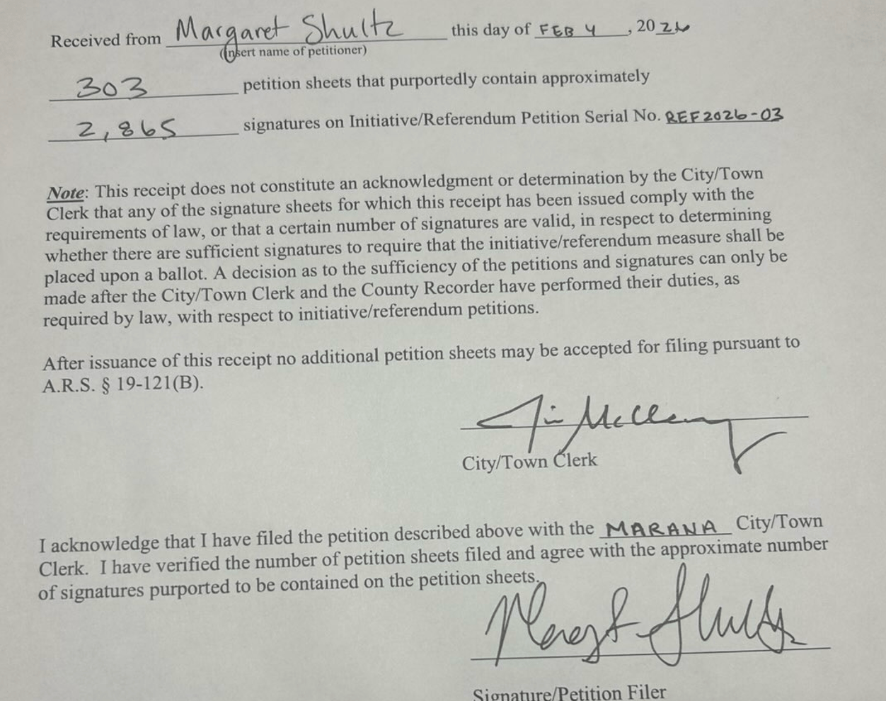 Signatures vs. servers: Groups opposed to the planned data center in Marana turned in 2,800 signatures to put the 600‑acre data center project on the ballot for voters to decide in the next general election. The signatures still need to be verified by the Marana town clerk, but organizers got twice the minimum of 1,382 signatures needed to qualify for the ballot.