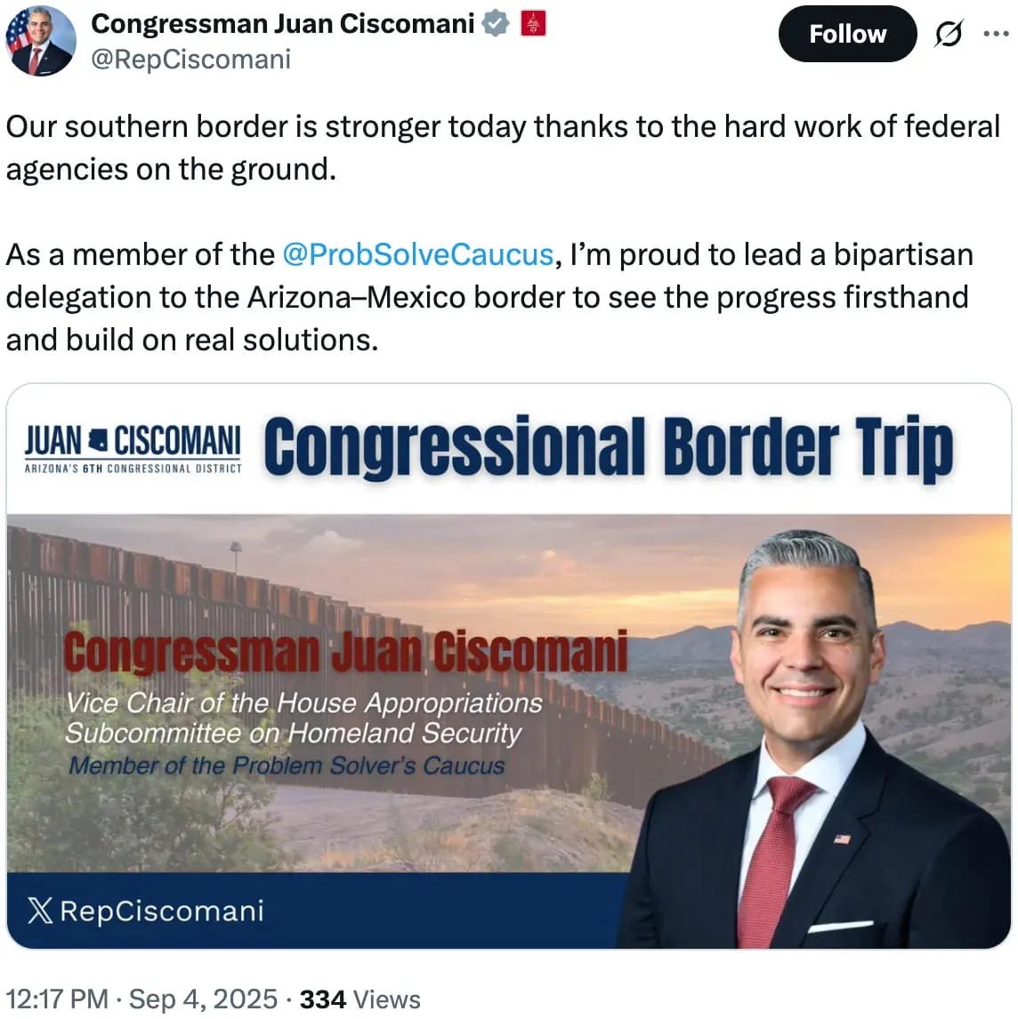 Tucson Republican Congressman Juan Ciscomani announced recently that he would lead a bipartisan delegation to the Arizona–Mexico border “to see the progress firsthand and build on real solutions.”