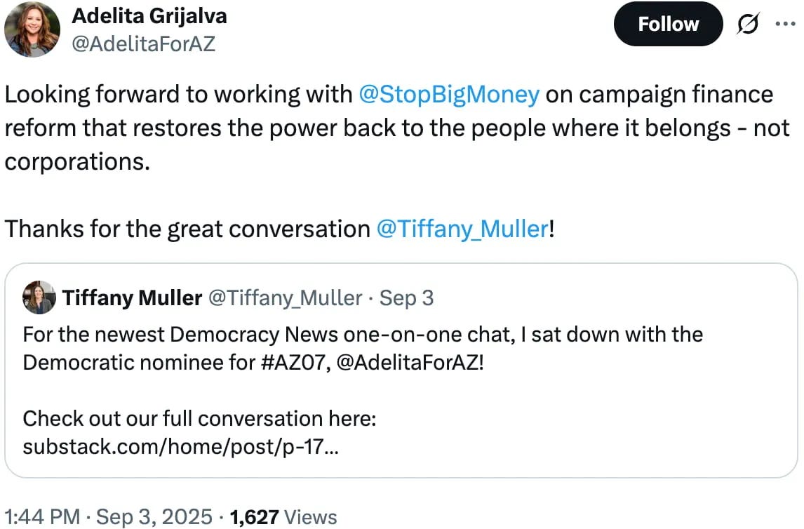 Congressional District 7 Democratic nominee Adelita Grijalva sat down with Tiffany Muller, president of End Citizens United, pledging to help overturn the now 15-year-old Citizens United v. Federal Election Commission SCOTUS decision.