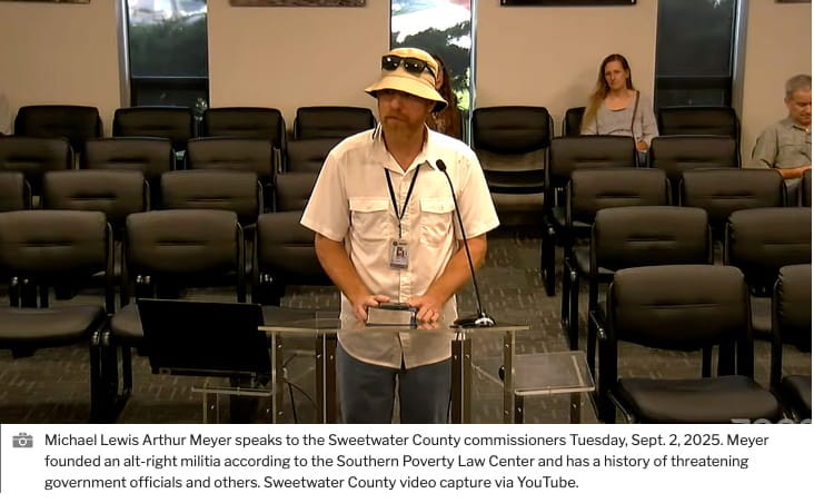 But that didn’t last long. A reporter at Sweetwater Now outed him as an “alt-right militia founder” two days after the county commissioners meeting.