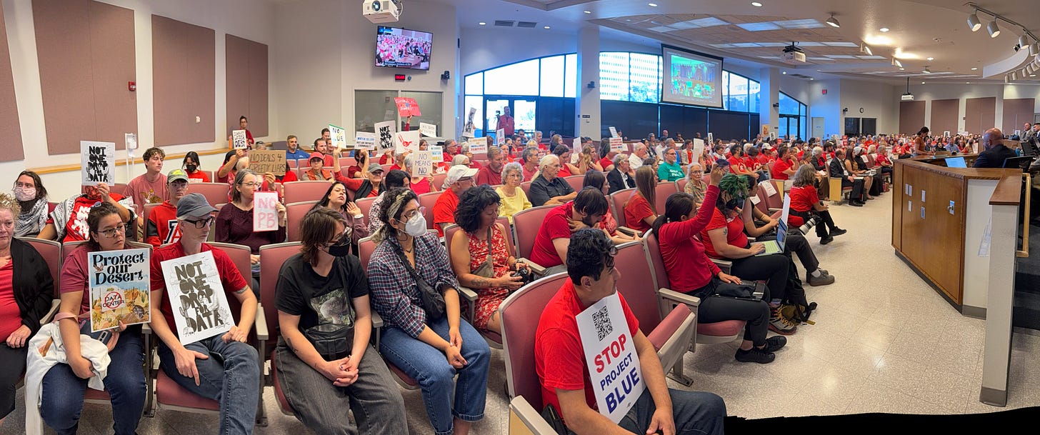 Dressed in red shirts and holding colorful signs, hundreds of No Desert Data Center Coalition members showed up to the morning meeting, pushing Supervisors Matt Heinz and Rex Scott to break their contract with the developers of Project Blue.