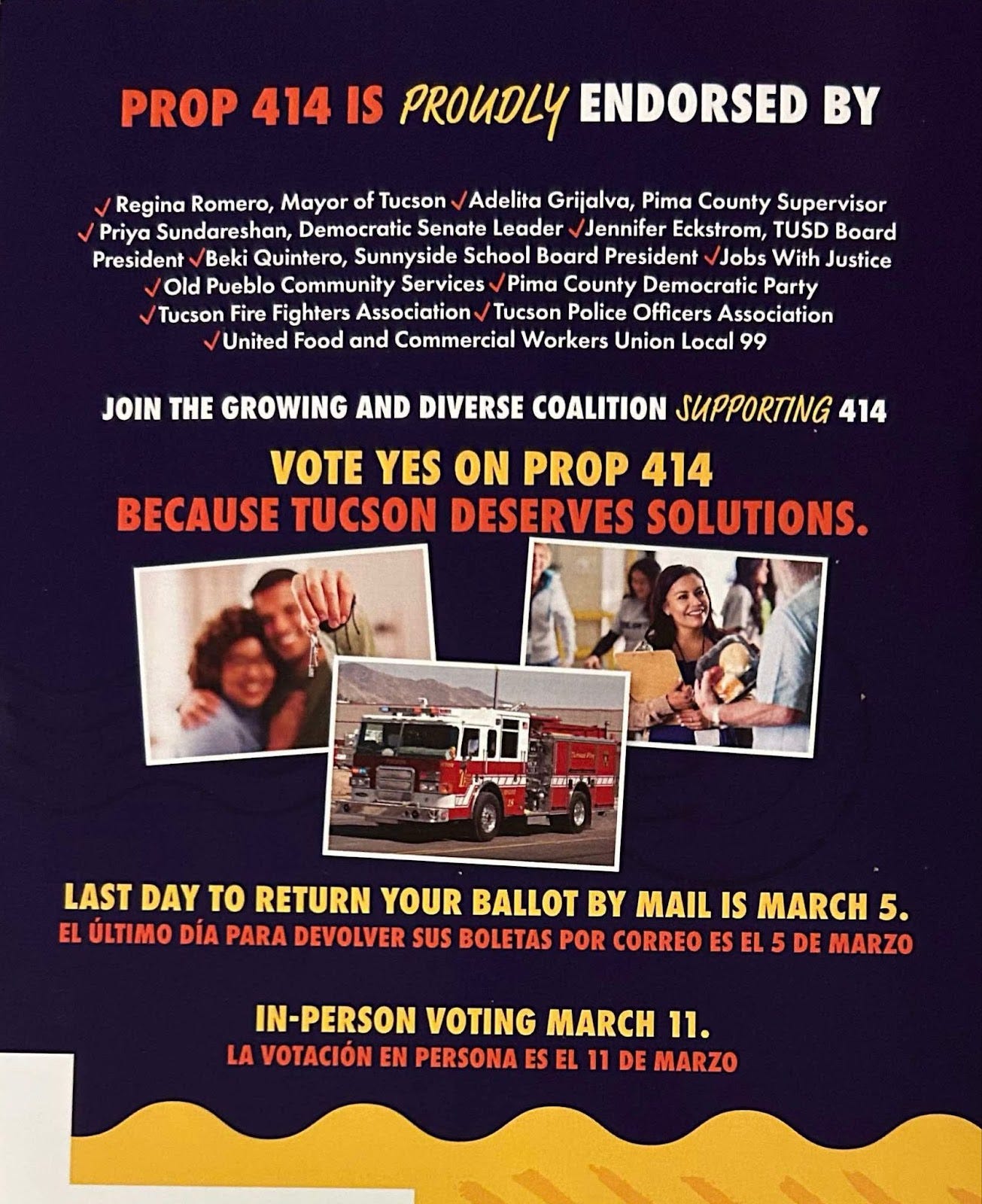 Another 15 individuals donated an additional $28,000 to the Yes on 414 campaign. Notable donors include former state Rep. Demion Clinco, real estate developer Scott Stiteler, business owner Fletcher McCusker, attorney Keri Sylvin, Tucson City Councilman Kevin Dahl and the chairman of the Yes on 414 campaign, Pat Deconcini.
