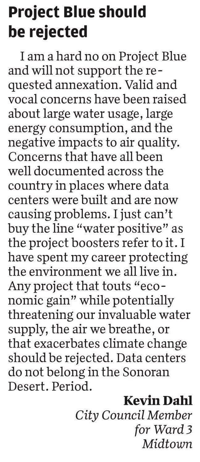 Tucson City Councilman Kevin Dahl is making one thing very clear: Project Blue isn’t getting past him without a fight.