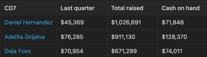 Three Democrats in the race — Daniel Hernandez, Adelita Grijalva, and Deja Foxx — reported an additional $200,000 in combined campaign contributions. Independent expenditure (IE) groups added an estimated $300,000 to the mix.