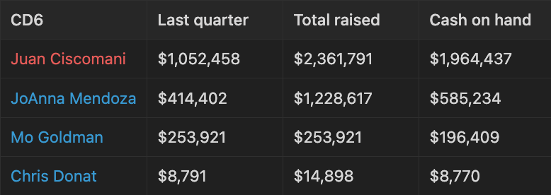 JoAnna Mendoza, a retired Marine, raised $414,402 in the same period, including $45,000 from PACs. But her campaign reported a high burn rate, spending $572,738 during the quarter — mostly on payroll, advertising, and travel.