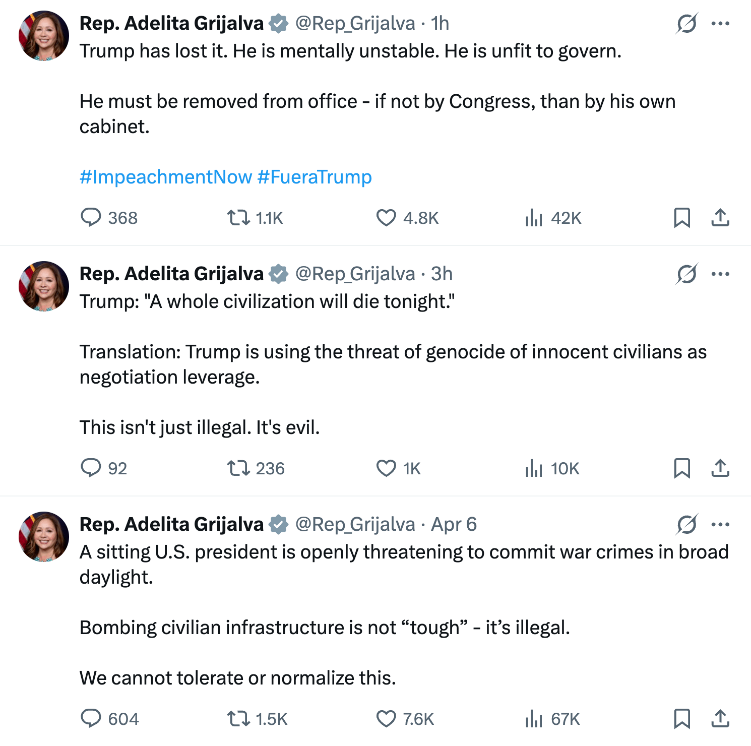 Grijalva was far more direct, telling us she categorically opposes any additional (and the previous) strikes in Iran.
