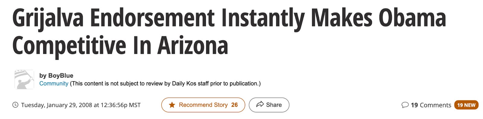 But as this post from 2008 shows, a Grijalva endorsement can impact political fortunes, including then-presidential candidate Barack Obama. He was also the first to endorse Bernie Sanders in 2015.