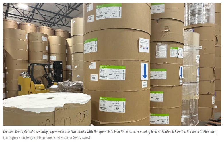 Paper weight: Ten tons of paper are sitting in a warehouse in Phoenix, the byproduct of efforts by misguided Cochise County officials who were convinced the 2022 election was stolen, Votebeat Arizona’s Jen Fifield reports. They wanted to test out security features like watermarks, but their planning was as ill-conceived as the endeavor itself. Now they’re trying to figure out what to do with all that paper.