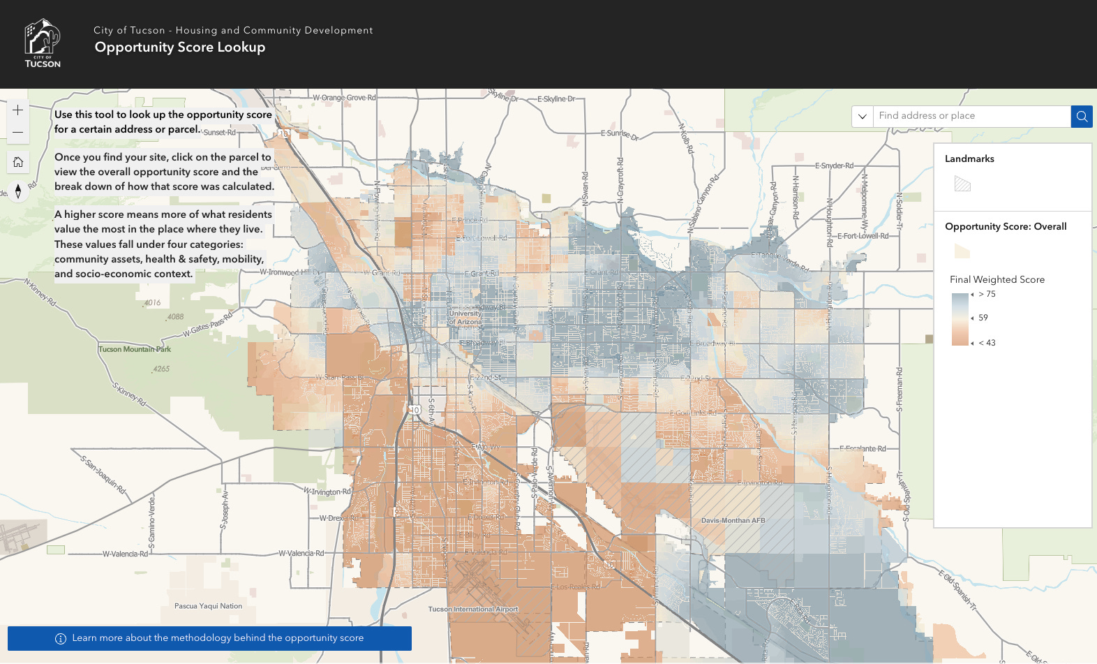 The City of Tucson has an interesting tool that lets you look up the “opportunity score” of a parcel of land. You can use it to see how your neighborhood compares to the city as a whole. City officials also use it to figure out where they should buy land and buildings for affordable housing. The score is based on factors like proximity to schools, parks, and grocery stores, as well as the crime rate and overall safety.