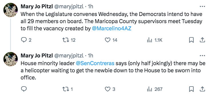 Left holding the bag: Cochise County Supervisor Peggy Judd says she feels abandoned by prominent Republican figures like pillow magnate Mike Lindell who said they would cover her legal bills if she pushed to hand-count ballots and delay certifying the results of the 2022 elections, VoteBeat Arizona’s Jen Fifield reports. She and fellow Supervisor Tom Crosby were indicted last year, but little funding for her legal costs has materialized, leaving her feeling “pissed.”