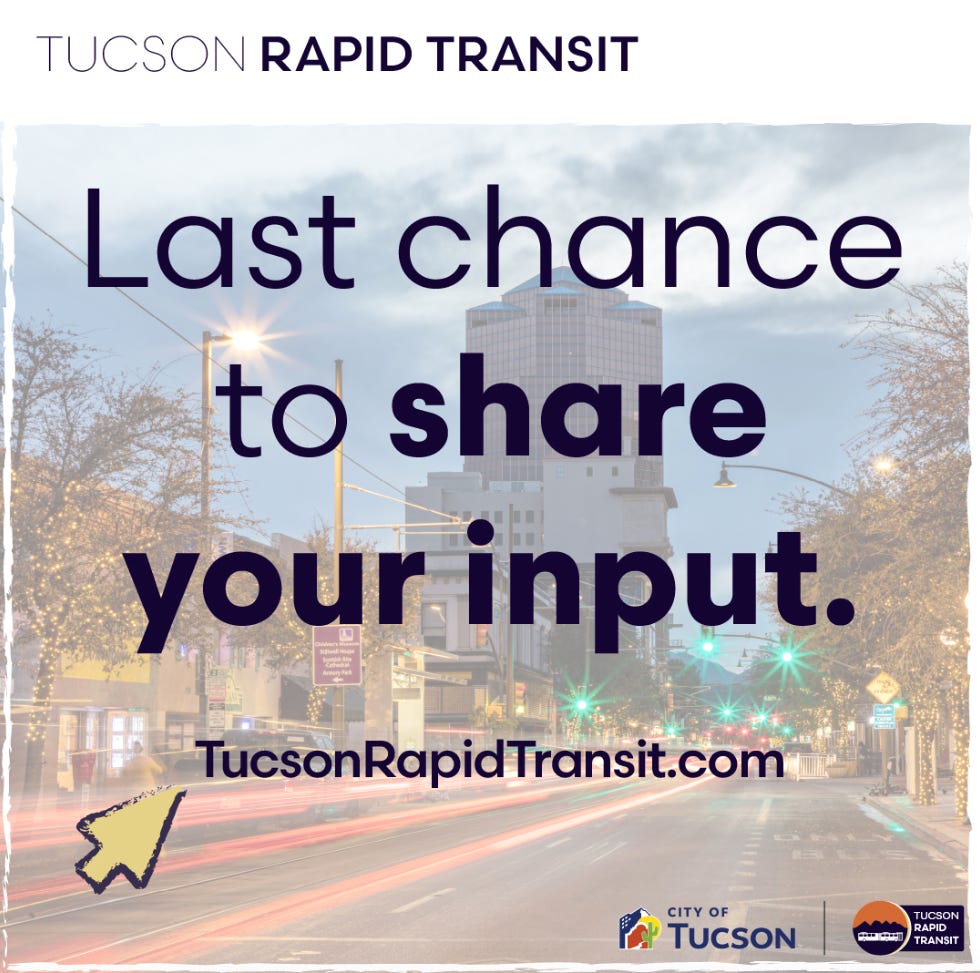 Stone or Oracle: Today is your last chance to weigh in on whether the city’s first Bus Rapid Transit corridor will be Stone Ave or Oracle Road. City of Tucson staff are asking residents to fill out a survey by 11:59 p.m.