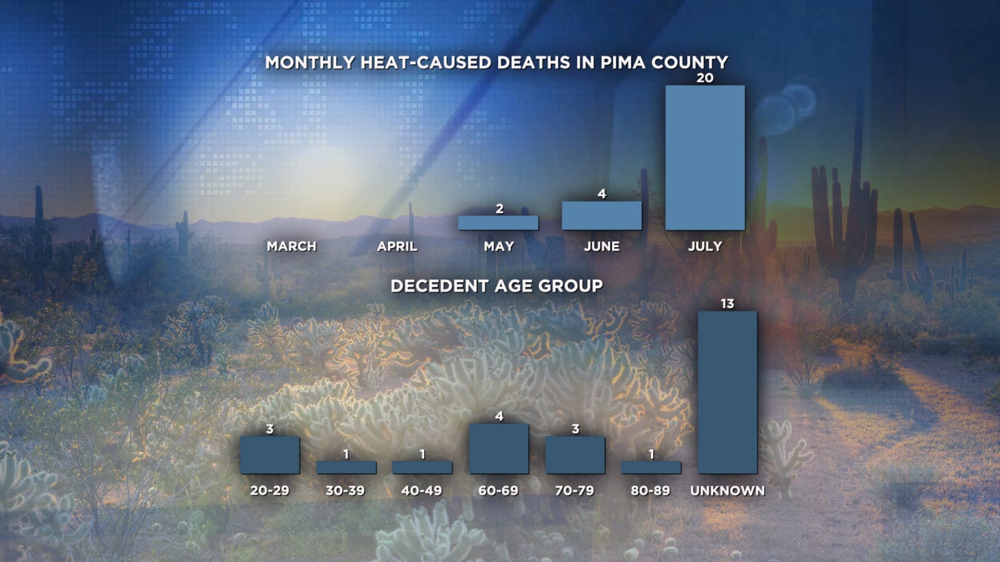 Heed those “excessive heat” warnings: Southern Arizona has seen a rising number of heat-related deaths amidst record-breaking summer temperatures, KVOA’s Lupita Murillo reports. Pima County has had 46 heat-related deaths this year, through the end of July. Pima County Medical Examiner Greg Hess said the death toll has increased since June 14, with 48 days this summer of 100-plus degree temperatures.