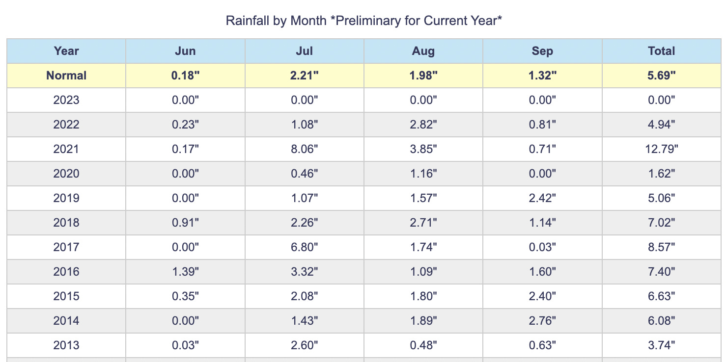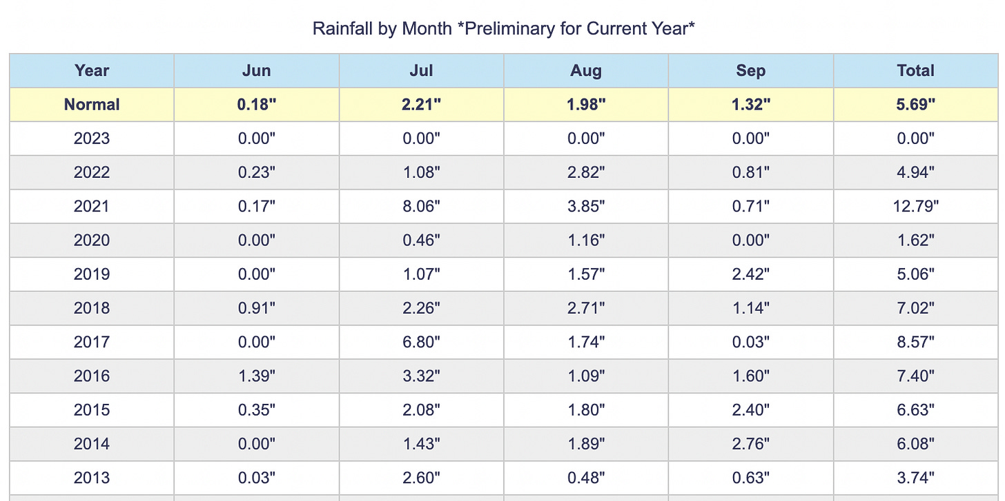 June isn’t typically a robust month in terms of rainfall, but we usually get a little something. In fact, the last time we had a June without even a the slightest hint of rain was 2020, and we all remember what a wonderful — and dry — year that was (total rainfall in Tucson was just 1.62”, the lowest recorded in the state since 1924.)