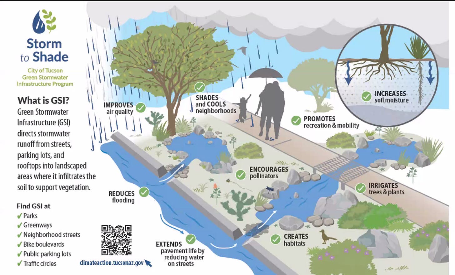 In 2019, Tucson’s mayor and council created the Storm to Shade program to build more stormwater infrastructure and plant more native vegetation in neighborhoods. Now, the city is trying to double-down on what’s already in the works: If there’s already a plan to build a bike path, then that’s a prime project for GSI.