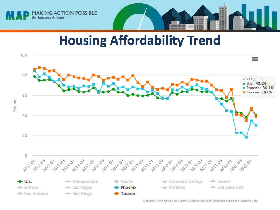 But the local home prices are still more than most Tucsonans can afford. About 39% of the Tucson homes sold in early 2023 would be affordable to somebody making the median income. That’s a big drop from 64% in 2021.