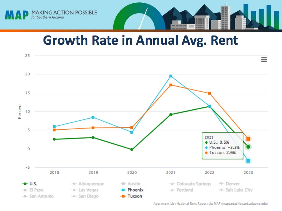 There is some good news about rent, though, Jennifer Pullen, senior research economist and program coordinator for MAP, said in a recent webinar. Rents are high in Tucson, but they aren’t rising much right now.