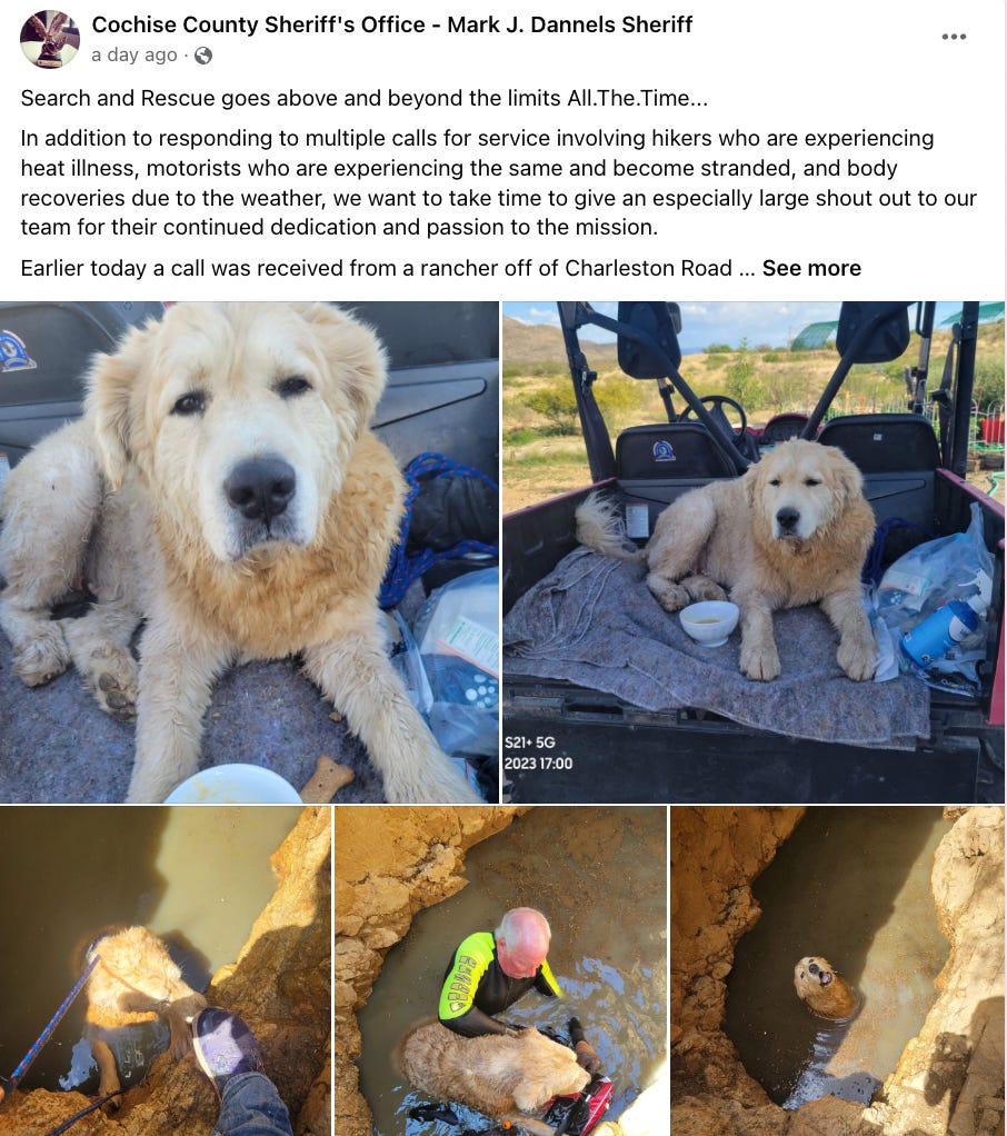 Good boy, Dusty: A Cochise County livestock guardian dog was rescued Monday, after falling into a mineshaft with water, the Arizona Republic’s Laura Daniella Sepulveda reports. The dog, named Dusty, was reported missing after he didn’t show up for breakfast at his farmhouse. Authorities said he likely fell into the mineshaft after he chased away a predator while protecting livestock overnight. Dusty was exhausted from trying to keep his head above water by standing on a ledge beneath the surface, and was also hypothermic and dehydrated.