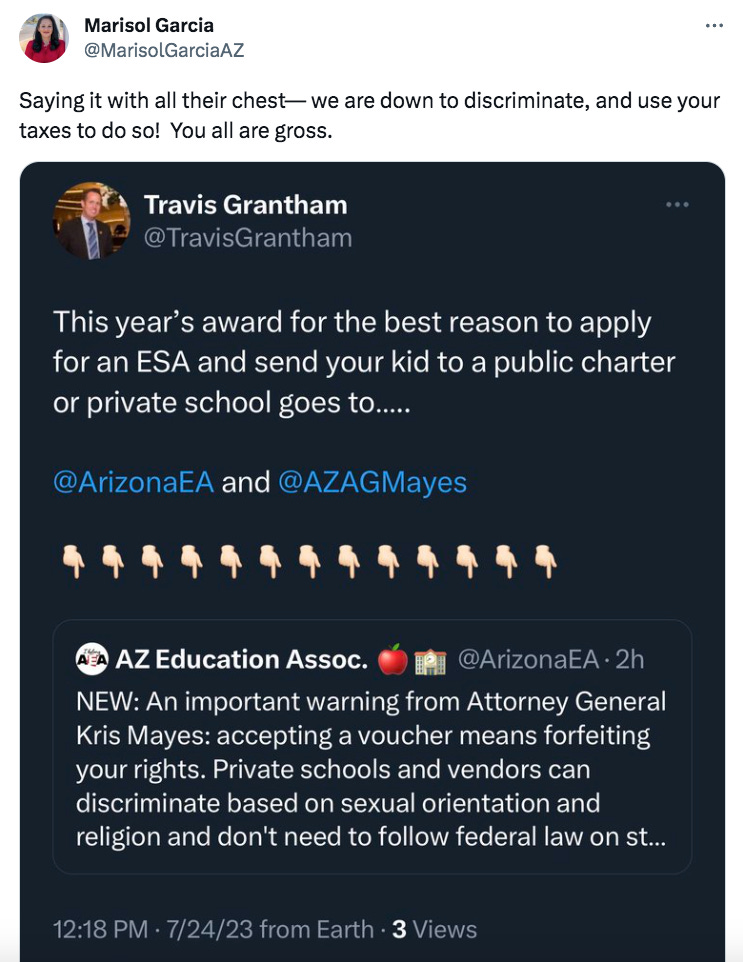 Public money is funding the ESA program, so I hope AG Mayes will assure financial accountability so we at least know what the money is funding. For example, is a fundamentalist sect buying antisemitic texts to "teach" children to hate Jews? Or, for that matter, is a Hasidic school, funded by ESA, not teaching math? (A recent problem in NYC: https://apnews.com/article/yeshiva-new-york-hasidic-investigation-224546cc4a2c654d0309acb959727ff6) Taxpayers deserve to know.