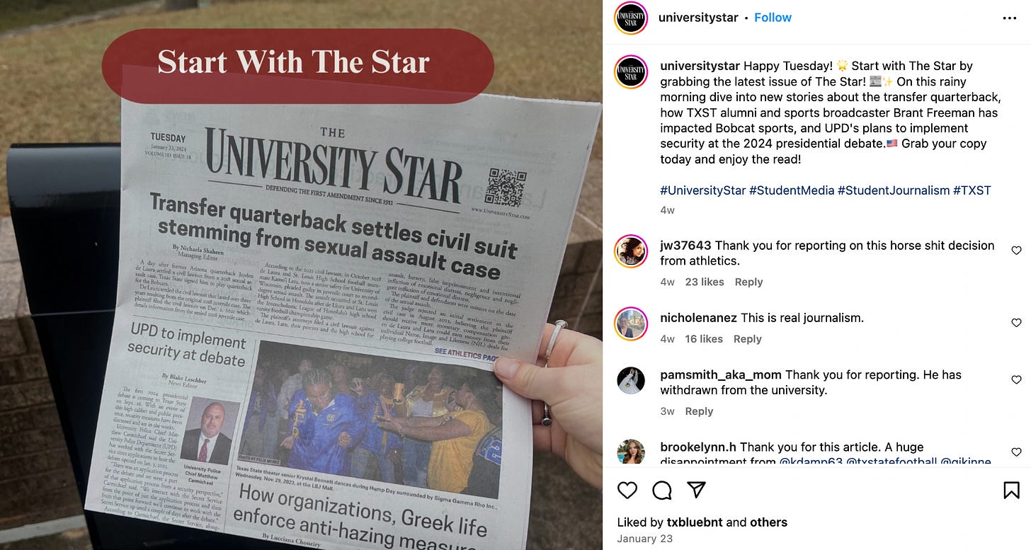 De Laura eventually lost his starting quarterback position and was ultimately cut from the team, transferring to Texas State last month. Days later, amidst campus protests after the student newspaper broke the news of his amended settlement, de Laura withdrew his transfer.