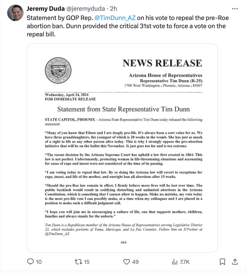 One step closer: The Arizona House voted to repeal the 1864 abortion ban on Wednesday, Axios Phoenix’s Jeremy Duda and Jessica Boehm report. Three Republican legislators joined Democrats in favor of Tucson Democrat Stephanie Stahl Hamilton’s bill to repeal the law. The next step is the Senate vote, which could come as soon as next week.