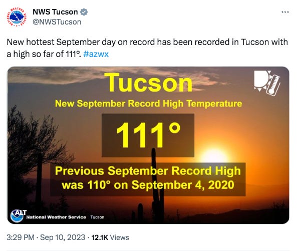 111: The temperature in Tucson on Sunday, which set a record for the hottest September day.