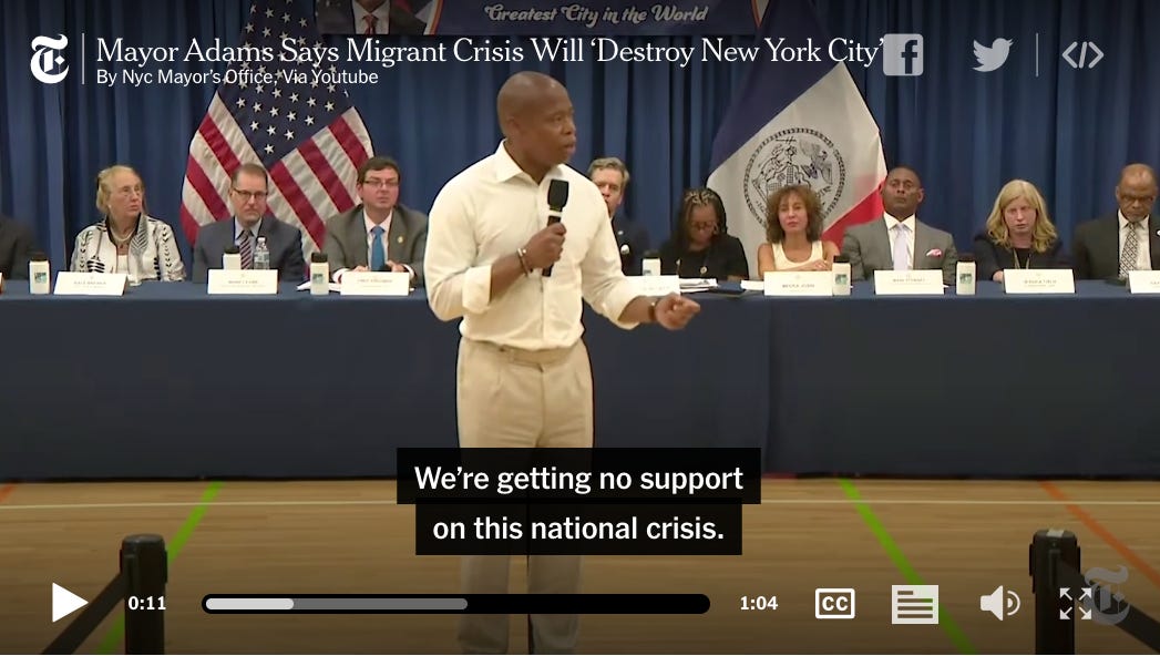 Adams is escalating his comments about funding for asylum seekers. Last week, he said “this issue will destroy New York City” and called for 15 percent budget cuts across city departments.
