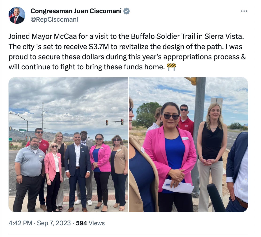 Preserving history: Congressman Juan Ciscomani was in Cochise County Thursday, announcing plans for $3.8 million in reconstruction to part of the Buffalo Soldier Trail, KGUN9’s Alexis Ramanjulu reports. Sierra Vista officials say there’s about $24 million worth of work to be done to three miles of the road, with the newly secured funding to be used for phase one of the project, which will cover half a mile in repairs and reconstruction.