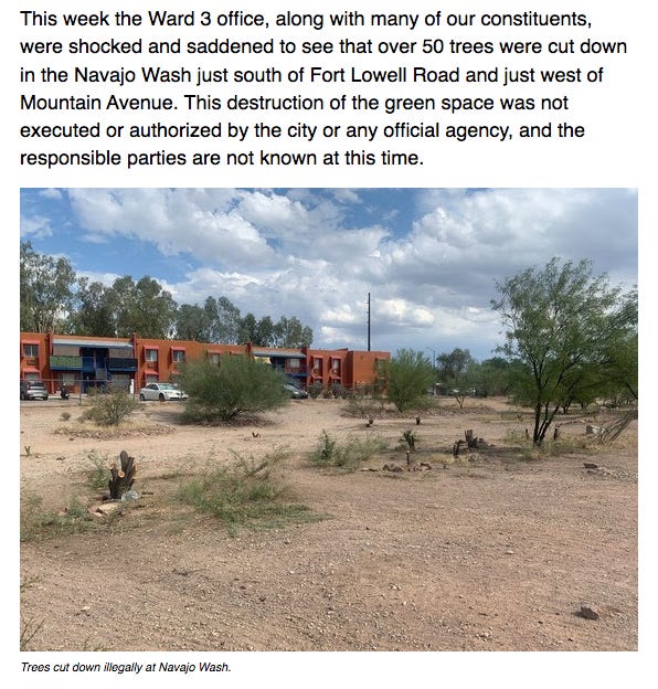 Timber: City officials are investigating more than 50 trees that were cut down in Navajo Wash by a contractor working with a nearby neighborhood association, the Arizona Daily Star’s Nicole Ludden writes. Tucson City Councilman Kevin Dahl said the action wasn’t authorized by the city or any official agency. The secretary of the Hedrick Acres Neighborhood Association told the Star that the association accepted a donation from a resident and paid a landscaper to clear the trees.