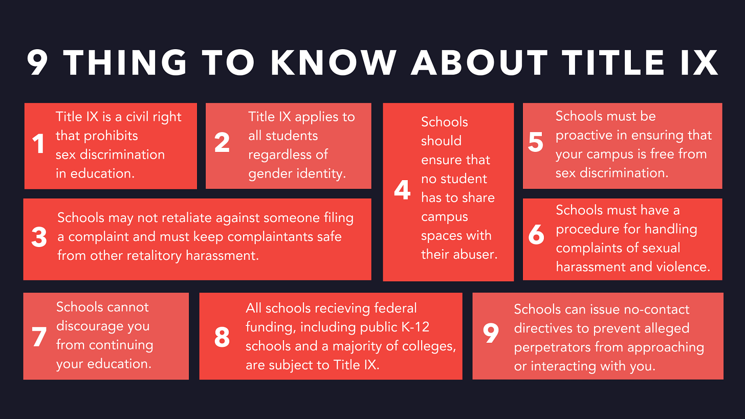 Title IX is a federal law that says students have the right to an education free from discrimination and harassment, including sexual abuse, stalking and dating violence.