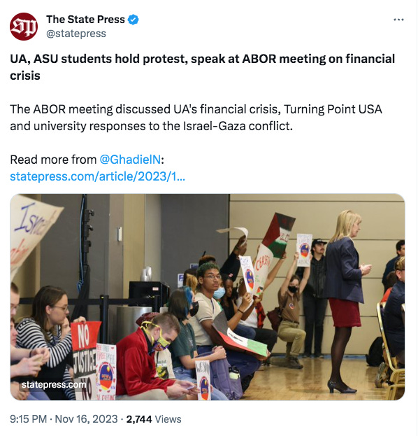 Professors suspended: Another audio recording of a University of Arizona class is causing trouble. A recording of a class discussion about the Israel-Hamas conflict went viral on social media and led to the suspension, with pay, of two professors in the College of Education, Arizona Public Media’s Paola Rodriguez reports. The audio was posted on a pro-Isreal account with 260,000 followers.