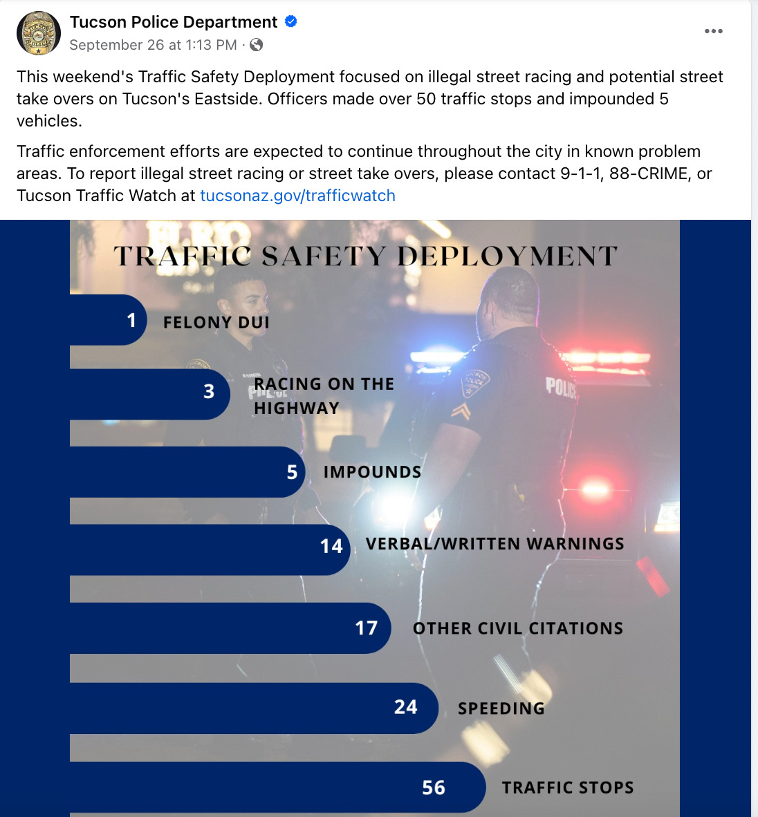 He pointed to a high-profile incident in August at Pantano and Escalante involving a street stunt show that drew more than 100 people and saw drivers brandishing guns. He noted that news coverage failed to mention that arrests were made and six vehicles impounded and that there have been more than 200 street racing-related arrests so far this year. But arresting offenders isn’t enough of a deterrent most of the time.