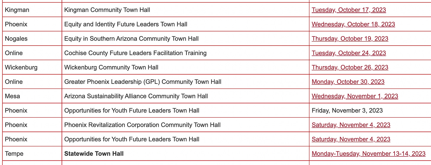 More than a dozen town halls have already taken place and several more are scheduled for Bullhead City, Wickenburg, Nogales and a few other municipalities. Organizers are trying to get as much feedback as possible before the Nov. 13 and 14 statewide gathering and culminating event in Tempe.