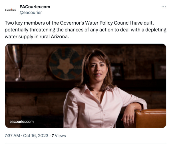 Water is never easy: Several Southern Arizonans are taking heat after they walked away from a water policy council set up by Gov. Katie Hobbs to update the state’s 1980 groundwater law, Capitol Media Services’ Howard Fischer reports. Supervisors from four counties criticized state Sen. Sine Kerr and Stefanie Smallhouse, who raises cattle in Pima County, for leaving the council, along with their ally, Hereford state Rep. Gail Griffin. The trio said the council wasn’t addressing the concerns of farmers. Travis Lingenfelter, chair of the Mohave County Board of Supervisors, said the trio were “acting like spoiled children who are not getting their way."