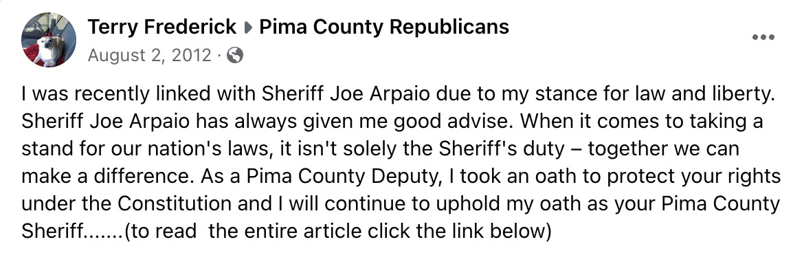 You might not remember Terry Frederick, but he explored a run for Sheriff back in 2012 and warned voters during speeches that if then-Sheriff Clarence Dupnik were reelected, he’d only serve two years before handing the reins to someone else to finish out the rest of his term.