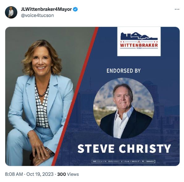 Seal of approval: Pima County Supervisor Steve Christy, the lone Republican on the Board of Supervisors, endorsed Republican mayoral candidate Janet Wittenbraker in her effort to unseat Mayor Regina Romero in November.