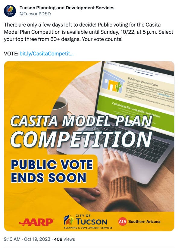 Casita votes: Sunday is the last day to vote in the casita model competition. City of Tucson staff will take into consideration the public’s votes when they select which models will get the fast-track permitting treatment. There are more than 60 models to choose from and some of them look pretty cool.