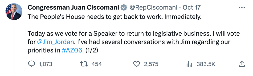 Even though Jordan has flamed out as the GOP nominee, we can't let Ciscomani "memory hole" his shameful votes to elect an insurrectionist, who voted to cancel Arizona's votes in 2024, as Speaker of the House.